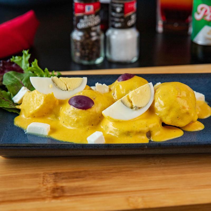 Boiled potato slices covered in a spicy aji amarillo sauce and cheese, garnished with queso fresco, boiled eggs, and olives | Contains milk.