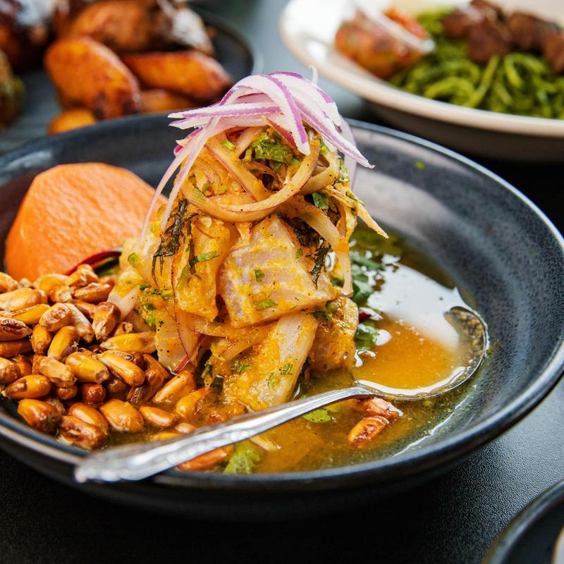 Fish - $19.00 | Seafood - $22.00 • Raw fish marinated and cooked with freshly squeezed lime juice, sliced red onions, cilantro, and ají amarillo (chili peppers). Served with Peruvian corn on the cob, sweet potato, and Peruvian chulpe corn | Imported shrimp.
